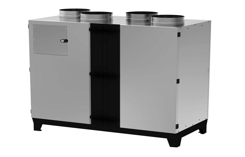 В таком варианте также используется наборная система вентиляции, которая состоит из двух вентиляторов, рекуператора, фильтров, калорифера и заслонок. Рекуператор используется более мощный, его КПД достигает показателя 93%, поэтому калорифер используется редко, чаще в качестве резервного нагревателя.
