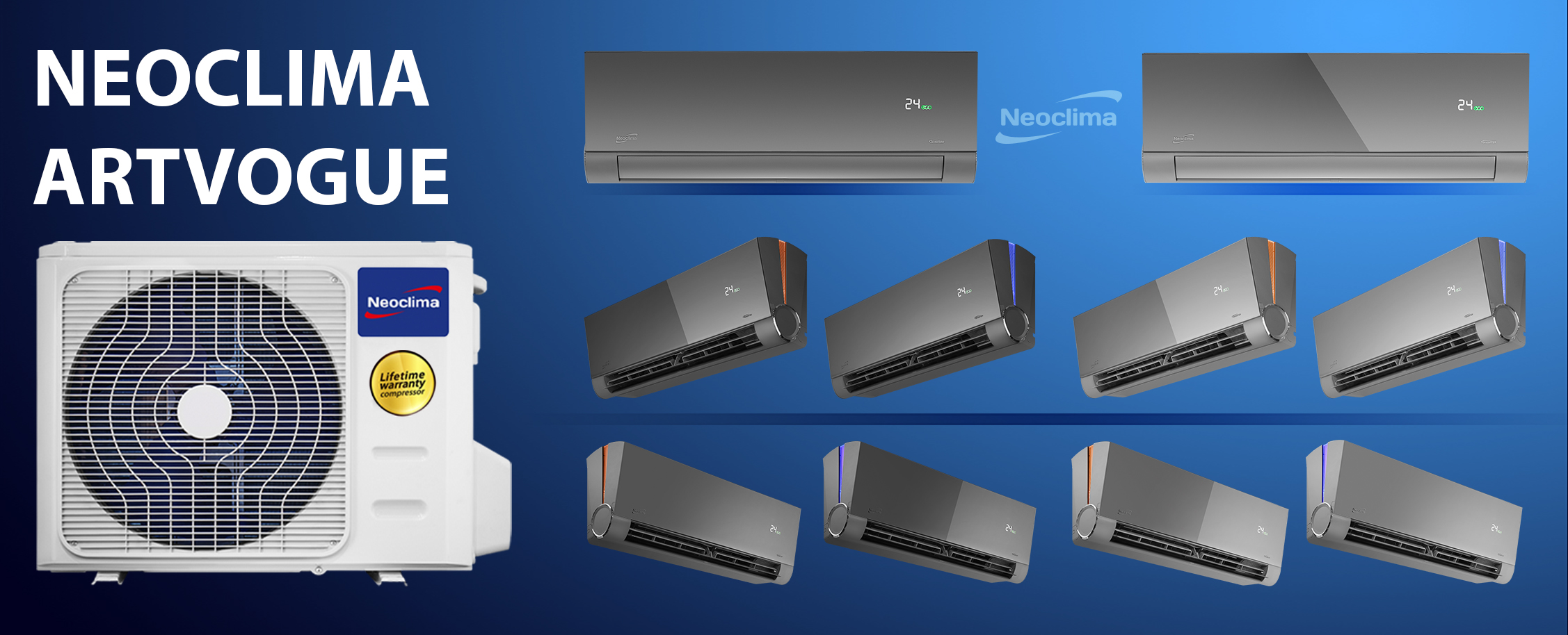 Neoclima серия ArtVogue Inverter NS-09EHVIws. ArtVogue Inverter – уникальная серия кондиционеров NEOCLIMA, которая отличается особым внешним оформлением и дизайном. Она работает на озонобезопасном фреоне, который не только обеспечивает экологичность, но и значительно увеличивает энергоэффективность устройства. Климатические агрегаты подойдут для квартир, частных домов, общественных и административных зданий разной площади.
