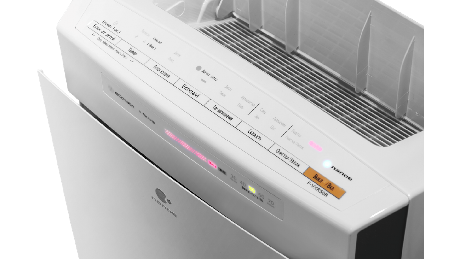Одной из особенностей Panasonic F-VXR50R-W наличие информативной панели для контроля, обладающей LED- подсветкой, как следствие наличия датчика освещения, она выключается при роботе в ночном режиме. О загрязнении, или чистоте воздуха Вас тоже проинформирует очиститель, за счет яркой LED-подсветки. Передняя панель воздухоочистителя моторизирована, благодаря чему при сдвиге образует доступ ко всем фильтрам, а также дает возможность охватить весь воздух внутри комнаты. Воздухоочиститель обладает особой и неповторимой функцией Mega Catcher, которая всасывает грязный воздух имея расстояния от поверхности пола около 30 см, поскольку там наиболее загрязненный воздух.