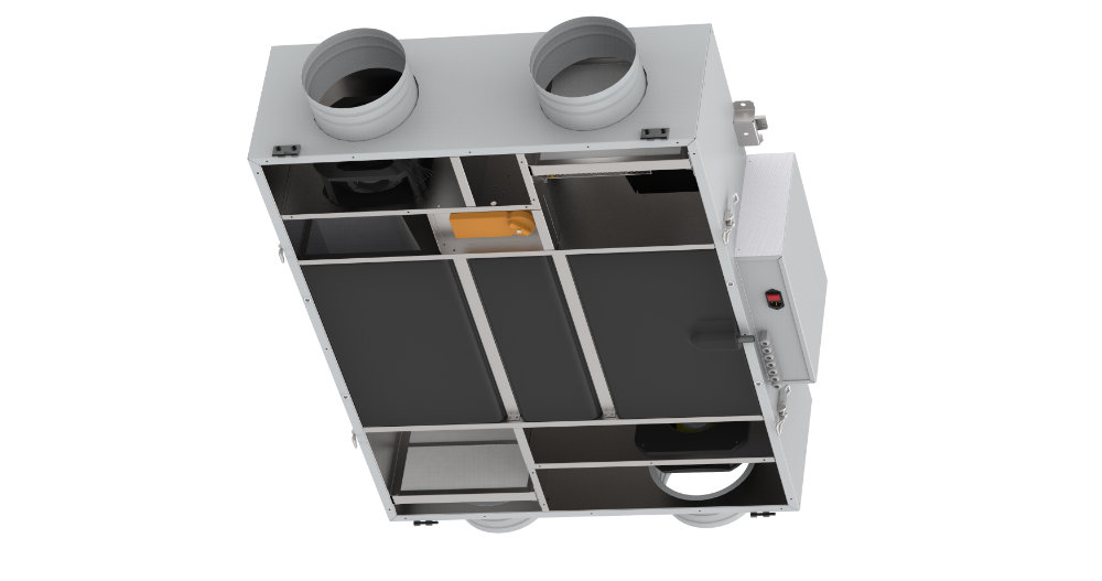 • Высокая температурная эффективность достигается за счет рекуперативного противоточного теплообменника с большой площадью поверхности теплообмена. Он сделан из прочного запатентованного пластика. Теплообменник обеспечивает высокую внутреннюю герметичность, благодаря чему потоки свежего и вытяжного воздуха не смешиваются. Система рекуперации тепла оснащена стандартной автоматической системой байпаса, которая позволяет использовать механизм естественного охлаждения.