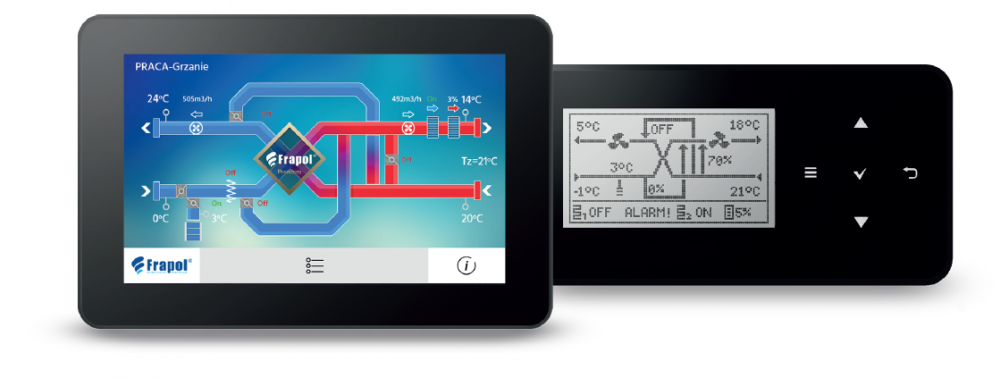 Современная система управления Frapol SMART, оснащенная системой рекуперации Frapol Sky 1500 Net Recovery, объединяет обслуживание системы рекуперации тепла, теплообменники, системы вентиляции и охлаждения, измерительные датчики и другие установки, обеспечивая дистанционное управление с мобильного устройств. Интерфейс управления предоставляется через мобильное приложение, веб-браузер или панель оператора. Дополнительные функции для интеграции теплообменника с другими установками включены в новый сервисный интерфейс.