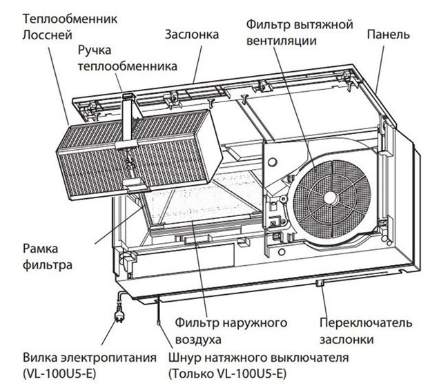 Конструкция Mitsubishi Electric LOSSNAY VL-100EU5-E спроектирована таким образом, что кроме вентилятора нет никаких движущихся частей. Это максимально упрощает управление машиной. Единственное, нужно следить за состоянием фильтров и теплообменников и регулярно их очищать. Для запуска и удаления воздушных масс используются специальные отверстия в стене (диаметром 85-90 мм). Перед попаданием в комнату, поток воздуха проходит через специальные фильтры, которые очищают его от всевозможных загрязнений, пыли, бактерий, запахов, химических аллергенов. Следовательно, в итоге мы получаем только чистый и свежий воздух.