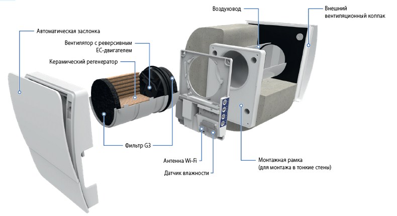 Рекуператор состоит из следующих конструктивных элементов: вставка, декоративное решетка в помещение, воздушная сеть с защитой от шума, внешний накопитель или корпус.