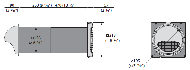 Данная модель имеет мощный вентилятор реверсивного типа (первая скорость вращения – 2,8 кВт, вторая – 4,8 кВт) с шасси и высокоэффективным ЕС-двигателем, который сокращает потребление энергии. Вентиляционный колпак, расположенный на задней стенке корпуса служит для отвода от наружной стены отработанного воздуха и конденсата, также он защищает устройство от попадания капель воды и других предметов.