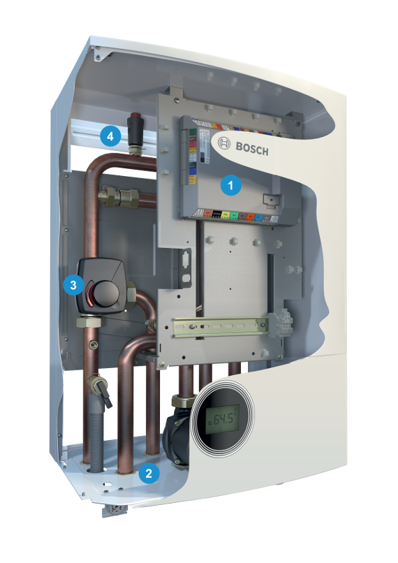 Тепловой насос с настенным блоком со смесителем используется в бивалентной системе с дополнительным источником тепла – например, с отопительным котлом. В таком случае основным оборудованием будет тепловой насос, а котел будет покрывать пиковые нагрузки, либо же работать параллельно при сильных морозах.