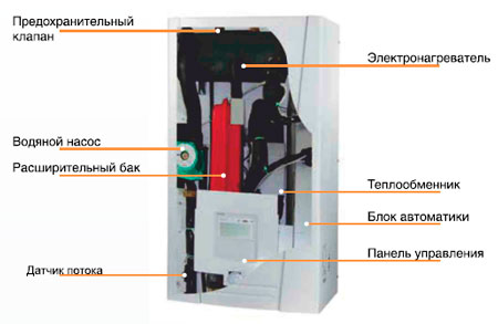 В небольшом корпусе модуля управления находятся высокоэффективный водяной насос (немецкой компании Wilo) и расширительный бак, паяный пластинчатый теплообменник, закрытый электронагреватель из нержавеющей стали и блок автоматики, а также датчик расхода и предохранительный клапан. На передней панели агрегата расположена электронная панель управления, которая служит для настройки параметров системы в соответствии с днем недели, временем и вашими собственными предпочтениями.
