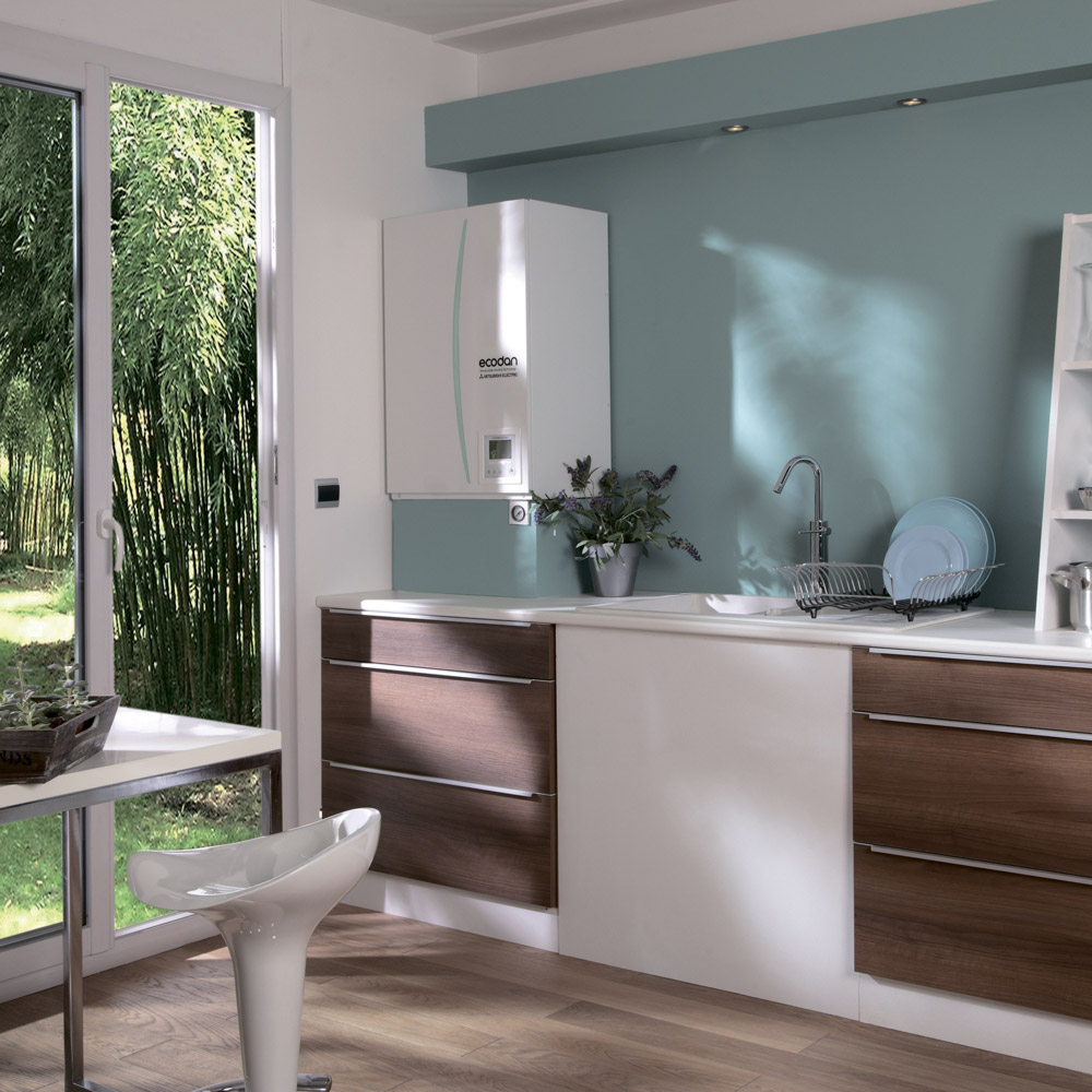 Компрессор теплового насоса Mitsubishi Electric Ecodan нагревает рабочую жидкость (хладагент) за счет низкопотенциальной тепловой энергии окружающей среды и электрической энергии. Затем хладагент нагревает воду в системе отопления и горячего водоснабжения.