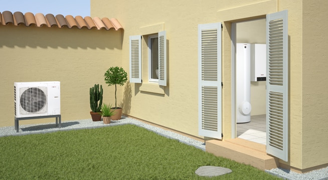 Внутренний блок по внешнему виду напоминает стандартный настенный домашний котел, он небольшой и может быть размещен внутри помещения. Внешний блок имеет компактные размеры и может устанавливаться в любом удобном для обслуживания месте – рядом со строением, на стене дома, на крыше или на любой площадке.