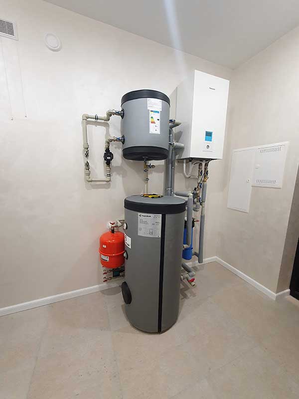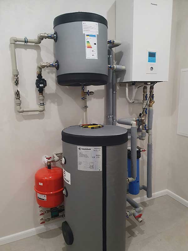 Тепловой насос значительно экономнее (в 3-4 раза), чем газовый котел отапливает дом и готовит воду в бойлере для горячего водоснабжения. Подготовленный низкотемпературный теплоноситель из буфера подается в коллекторы теплого пола. Погодя зависимая автоматика теплового насоса Panasonic регулирует температуру теплоносителя в зависимости от внешней температуры воздуха, что значительно снижает платежи за отопление.