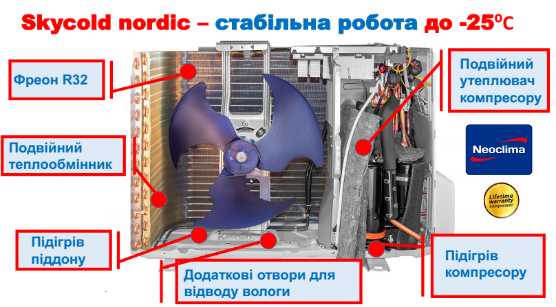 Високоякісна спліт-система, створена спеціально щоб, обігрів квартири став більш доступний. Кондиціонери серії Skycold Nordic має здатність роботи на обігрів при зовнішній температурі до -25 °C.